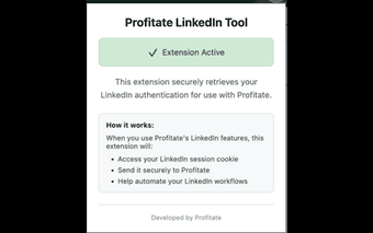 Profitate LinkedIn Tool, Chrome tarayıcısı için geliştirilmiş bir eklentidir. Bu araç, kullanıcıların LinkedIn hesaplarına ait kimlik doğrulama bilgilerini güvenli bir şekilde almayı sağlar. Kullanıcılar, LinkedIn'deki oturum açma işlemlerini kolaylaştırmak için bu eklentiyi kullanarak hızlı bir şekilde cookie bilgilerine erişebilirler.